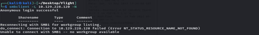 smbmap -H 10.129.228.120 -u SVC_APACHE -p '[email protected][email protected]*t13'[+] IP: 10.129.228.120:445 Name: flight.htbDisk Permissions Comment---- ----------- -------ADMIN$ NO ACCESS Remote AdminC$ NO ACCESS Default shareIPC$ READ ONLY Remote IPCNETLOGON READ ONLY Logon server shareShared READ ONLYSYSVOL READ ONLY Logon server shareUsers READ ONLYWeb READ ONLY