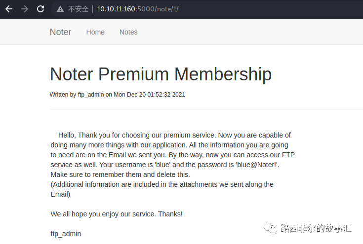 我们注意到,在这篇文章里,ftp_admin 用户有一份笔记,大意是说我们可以访问 FTP,并且给了我们一个账号密码
