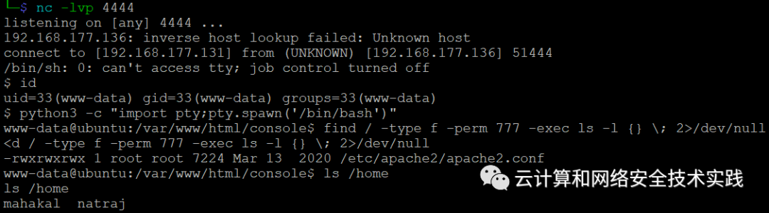转成交互式shell,python3 -c "import pty;pty.spawn('/bin/bash')",