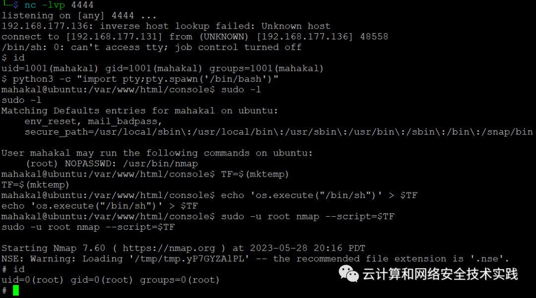 sudo -l查看到nmap程序有root权限,上GTFOBins,