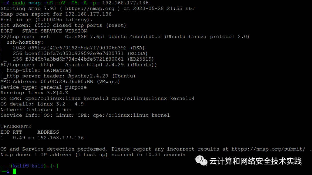 再继续做端口扫描,sudo nmap -sS -sV -T5 -A -p- 192.168.177.136