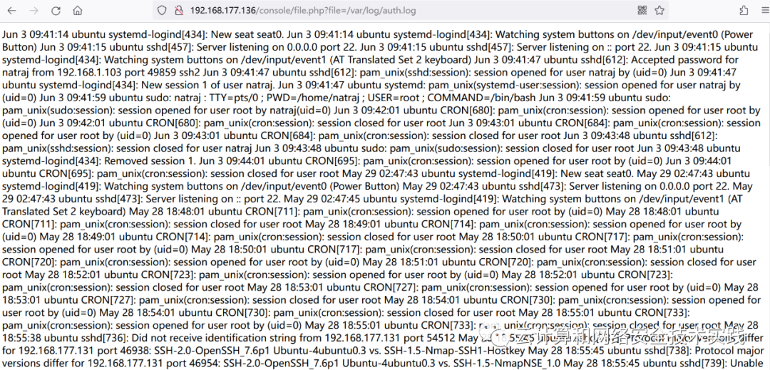 http://192.168.177.136/console/file.php?file=/var/log/auth.log,