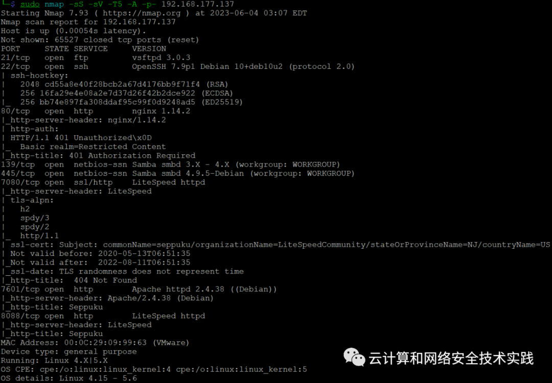 再继续做端口扫描,sudo nmap -sS -sV -T5 -A -p- 192.168.177.137