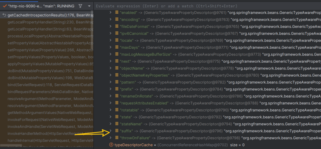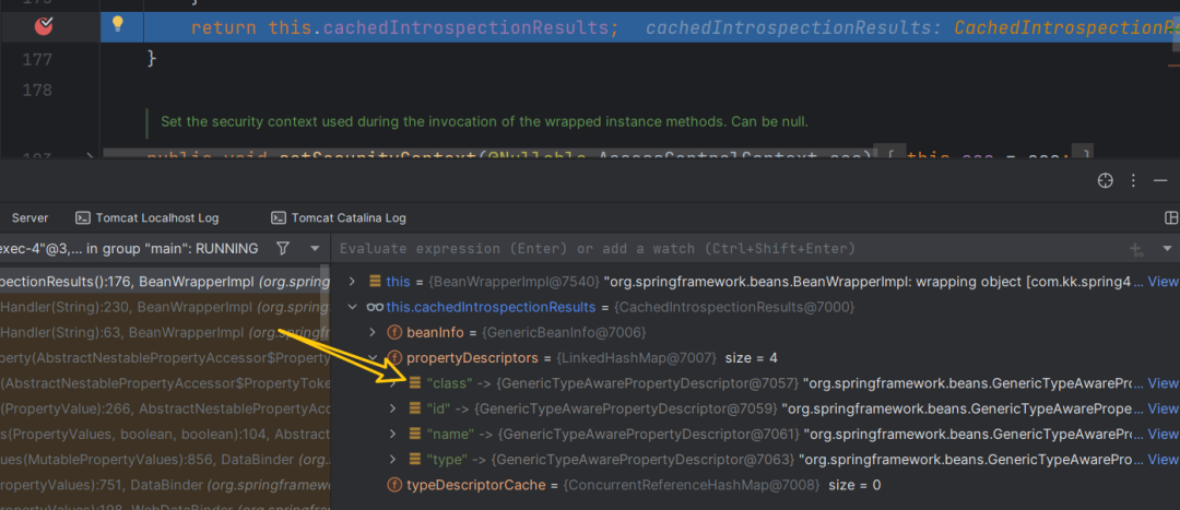 getCachedIntrospectionResults():176, BeanWrapperImpl (org.springframework.beans)getLocalPropertyHandler(String):230, BeanWrapperImpl (org.springframework.beans)getLocalPropertyHandler(String):63, BeanWrapperImpl (org.springframework.beans)getPropertyValue(AbstractNestablePropertyAccessor$PropertyTokenHolder):625, AbstractNestablePropertyAccessor (org.springframework.beans)getNestedPropertyAccessor(String):843, AbstractNestablePropertyAccessor (org.springframework.beans)getPropertyAccessorForPropertyPath(String):820, AbstractNestablePropertyAccessor (org.springframework.beans)getPropertyAccessorForPropertyPath(String):821, AbstractNestablePropertyAccessor (org.springframework.beans)doRun():1598, NioEndpoint$SocketProcessor (org.apache.tomcat.util.net)run():49, SocketProcessorBase (org.apache.tomcat.util.net)runWorker(ThreadPoolExecutor$Worker):1128, ThreadPoolExecutor (java.util.concurrent)run():628, ThreadPoolExecutor$Worker (java.util.concurrent)run():61, TaskThread$WrappingRunnable (org.apache.tomcat.util.threads)run():834, Thread (java.lang)
