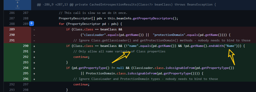 https://github.com/spring-projects/spring-framework/commit/002546b3e4b8d791ea6acccb81eb3168f51abb15?diff=unified在 PropertyDescriptor 的获取中,可以看到仅允许 name 和Name 开头的Class 类中的内容被允许,也就是说poc 中通过Class.getMoudle().ClassLoader() 获取的方式已经被死死地限制住了,通过两三行代码修复了这个漏洞。