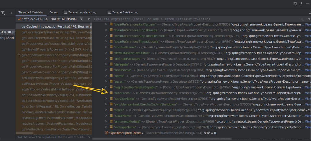 发送poc 再跟进一下,下面的resource 只有在tomcat 部署模式下才会出现,这也是为什么jar 包形式的部署方法无法触发此漏洞。