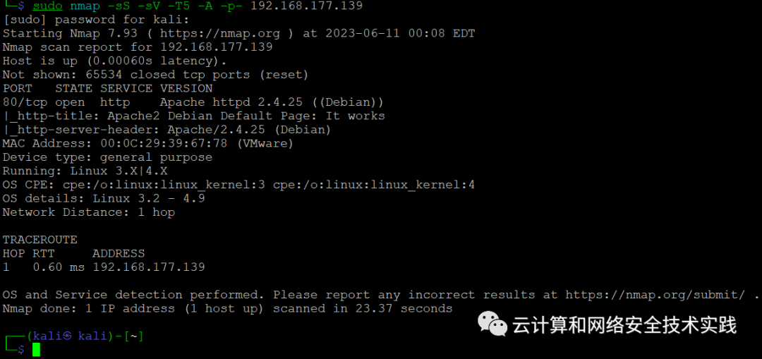 做端口扫描,sudo nmap -sS -sV -T5 -A -p- 192.168.177.139,