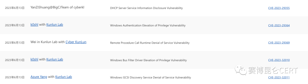 总共修复了个72漏洞,低危漏洞2个,中危漏洞3个,高危漏洞61个,严重漏洞6个,本月昆仑实验室研究员共协助微软修复了5个安全漏洞: