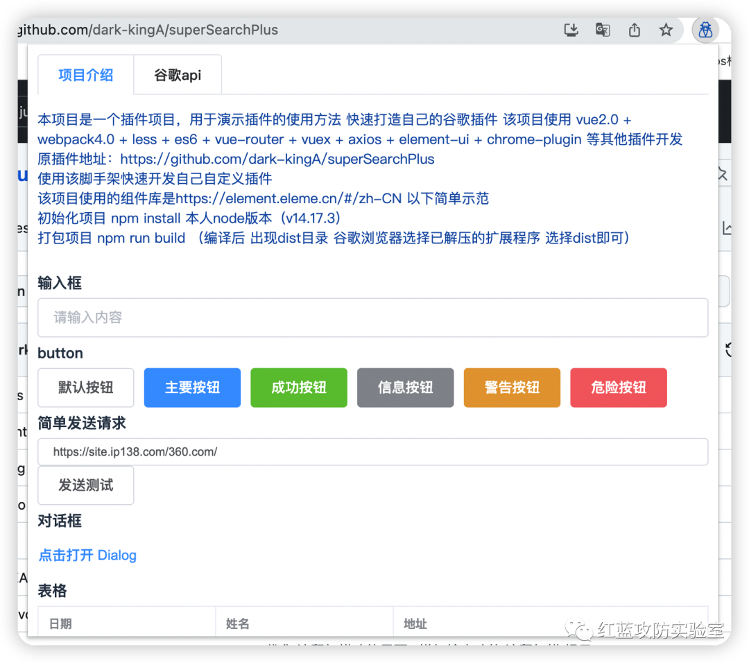 本项目是一个插件项目,用于演示插件的使用方法 快速打造自己的谷歌插件该项目使用 vue2.0 + webpack4.0 + less + es6 + vue-router + vuex + axios + element-ui + chrome-plugin 等其他插件开发原插件地址:https://github.com/dark-kingA/superSearchPlus使用该脚手架快速开发自己自定义插件。