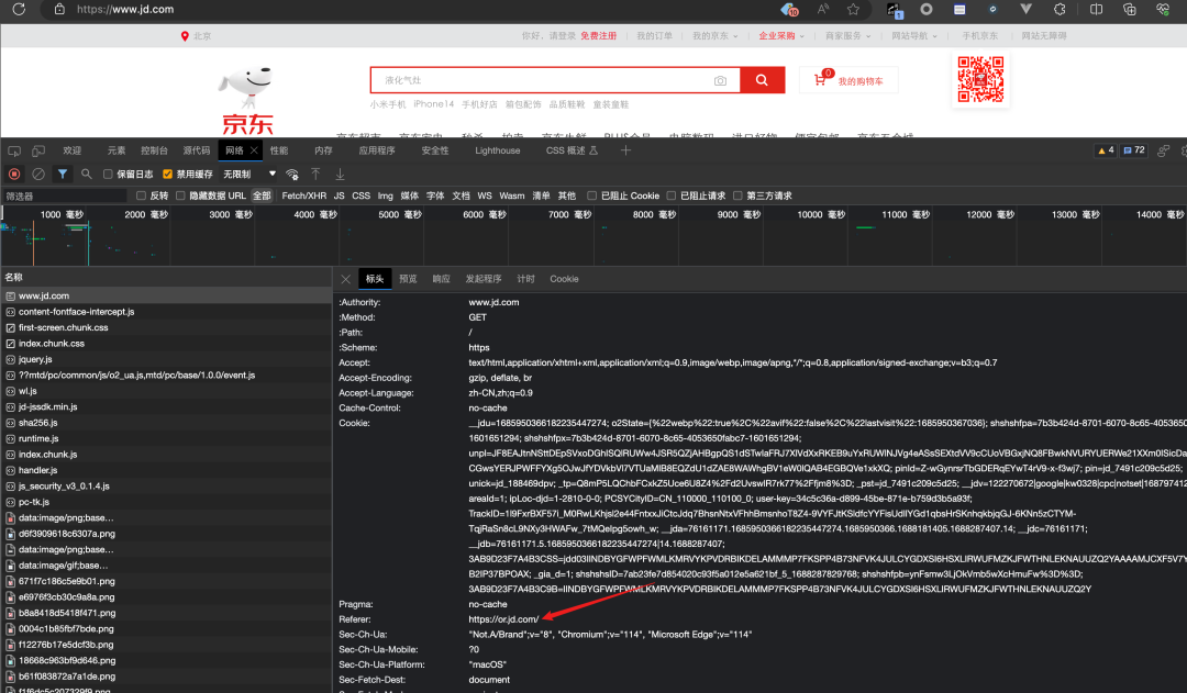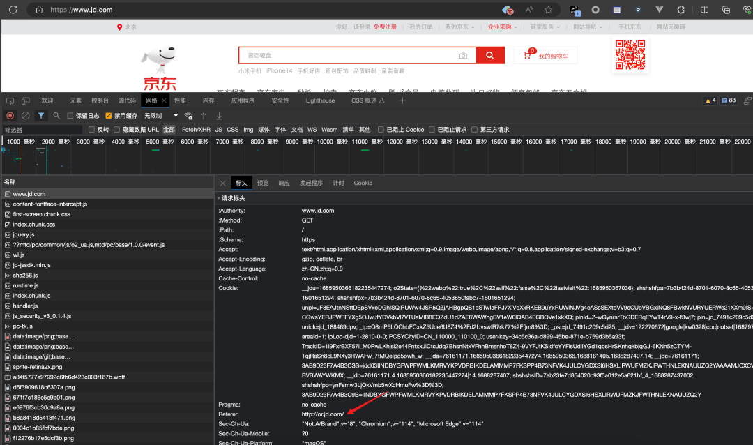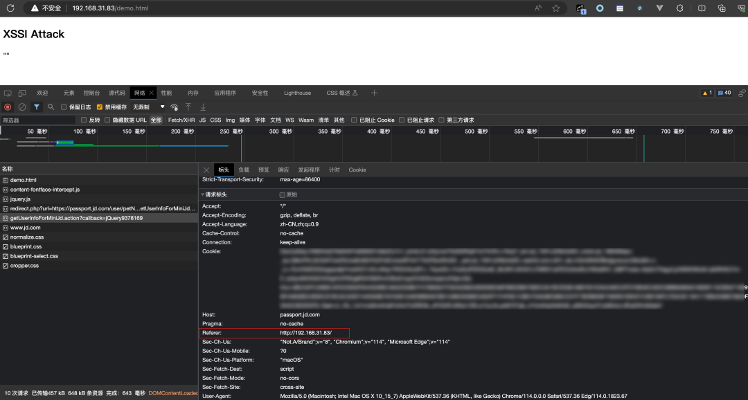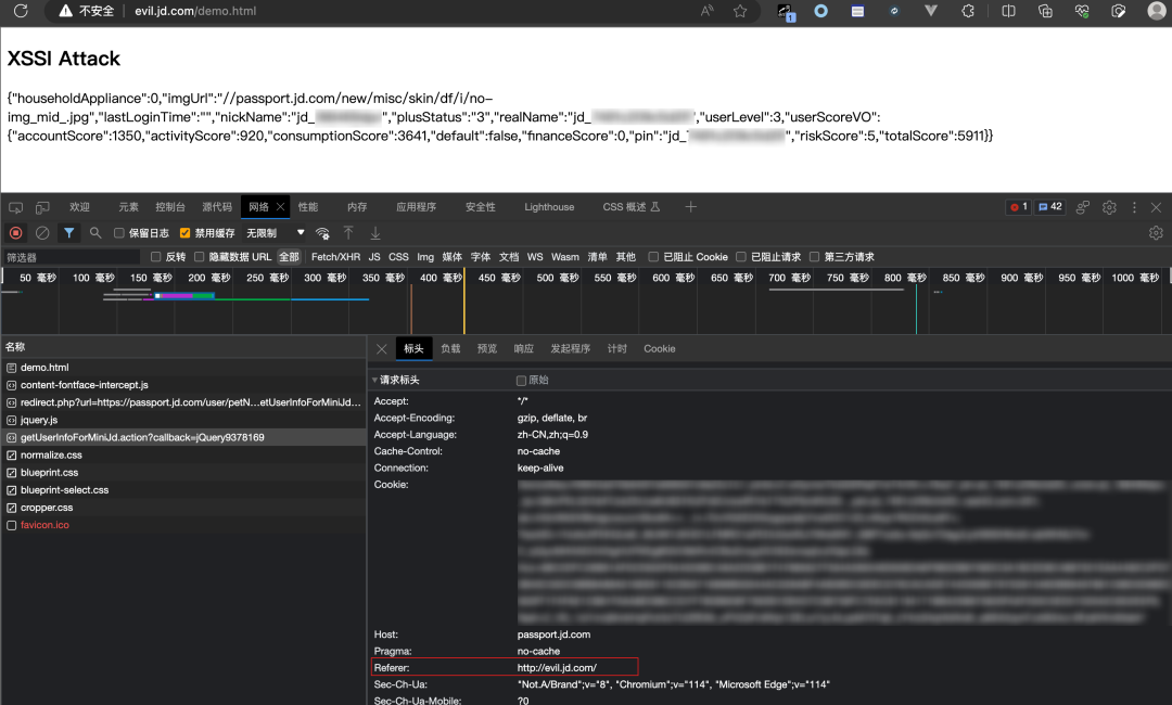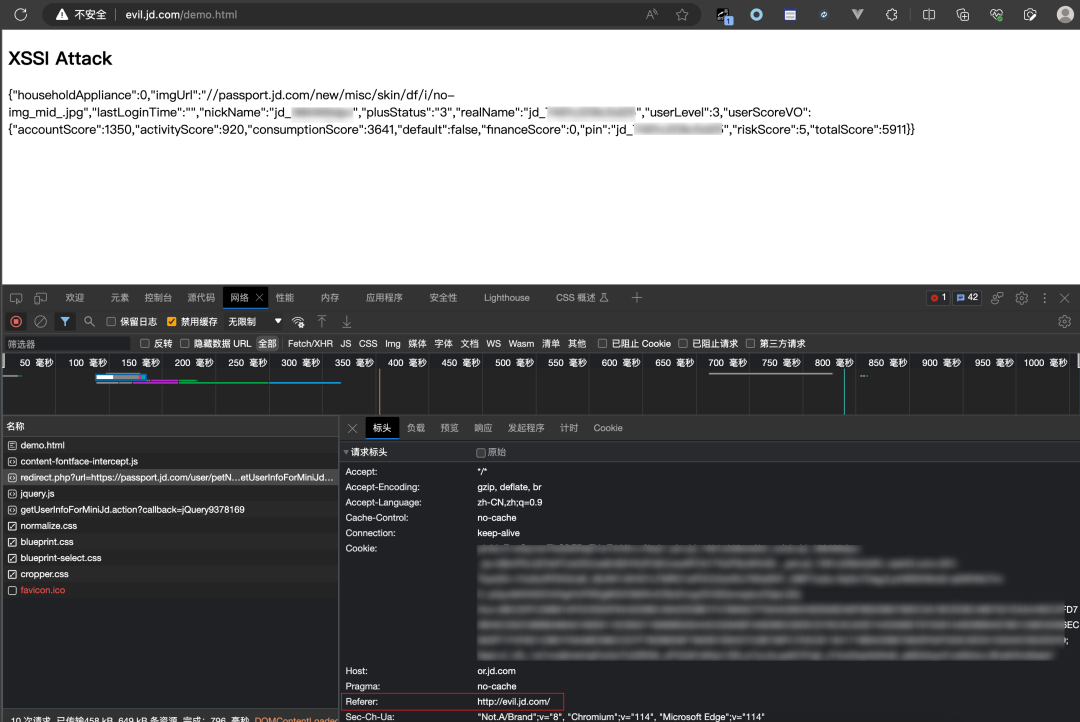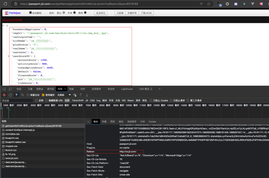 上面的演示能够成功是因为 https://b-plus.jd.com/api/user/getUserLevel?callback=jQuery9378169 这个接口只验证了 Cookie ,并没有做额外的验证,然而,对于用户敏感数据请求的接口,京东统一做了一项验证 —— referer 头