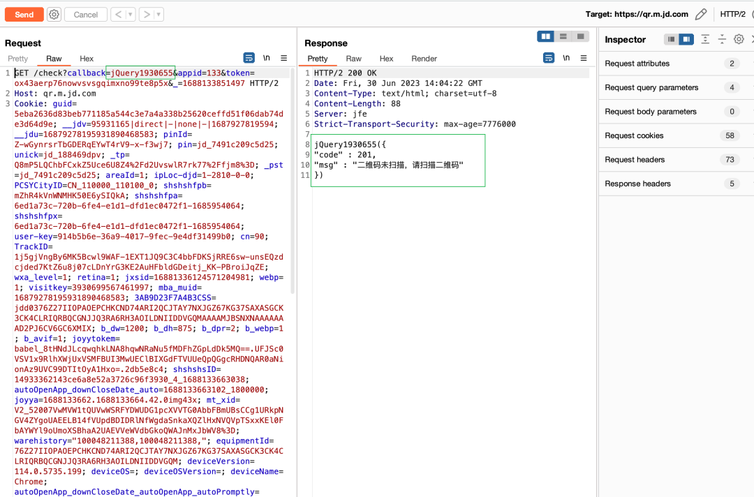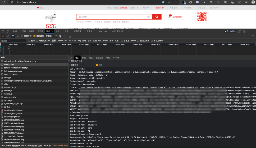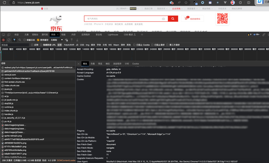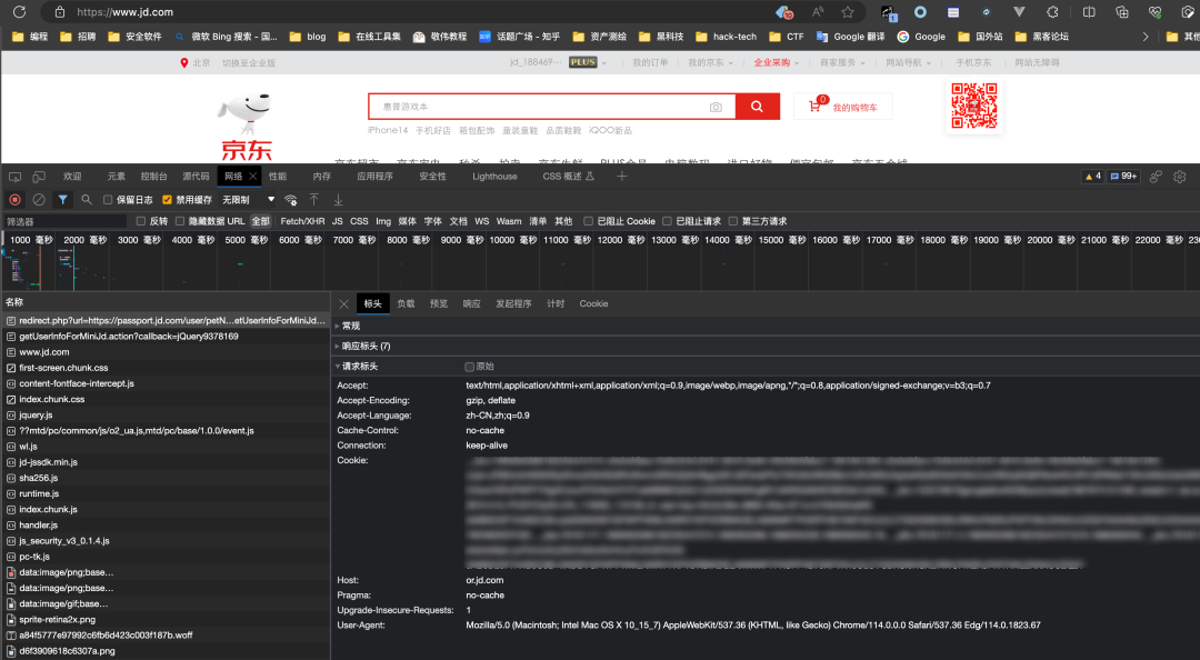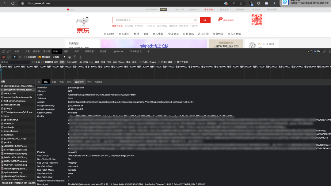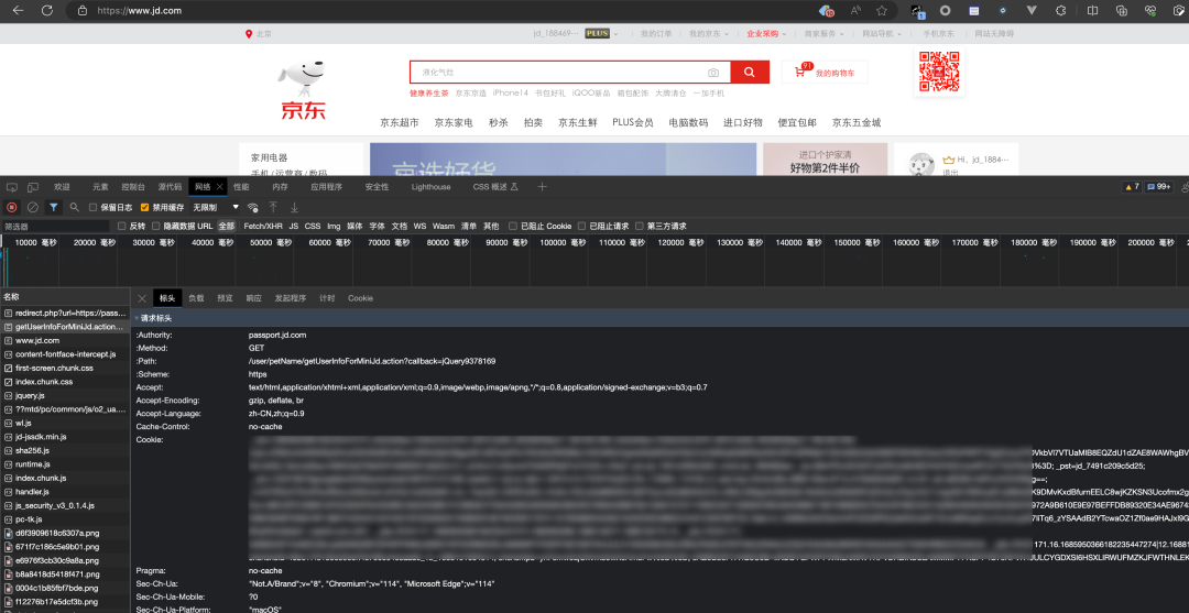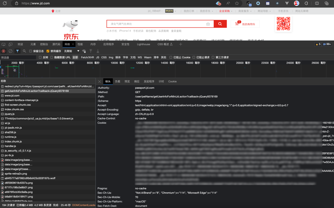 上面的演示能够成功是因为 https://b-plus.jd.com/api/user/getUserLevel?callback=jQuery9378169 这个接口只验证了 Cookie ,并没有做额外的验证,然而,对于用户敏感数据请求的接口,京东统一做了一项验证 —— referer 头