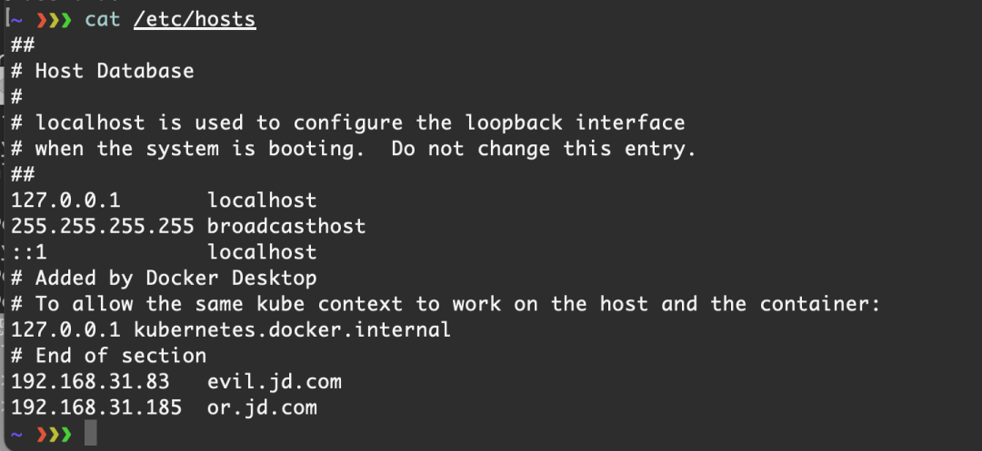 我的物理机扮演受害者,我是 Mac OS 操作系统,修改的文件为 /etc/hosts