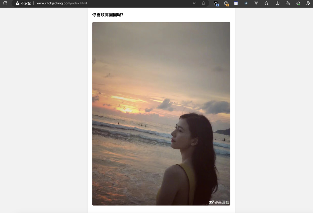 当前场景为:我们将某个非常吸引人的网站页面作为点击劫持的服务器端,吸引受害者来访问。有些时候,对普通人钓鱼,他看到jd.com 可能不屑一顾,但是看到什么吃瓜事件、美女图片啥的,那兴趣可大呢,我们这里就模拟一个经过分享美女图片的网站。在这个网站中使用 iframe 嵌入恶意代码