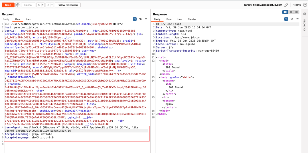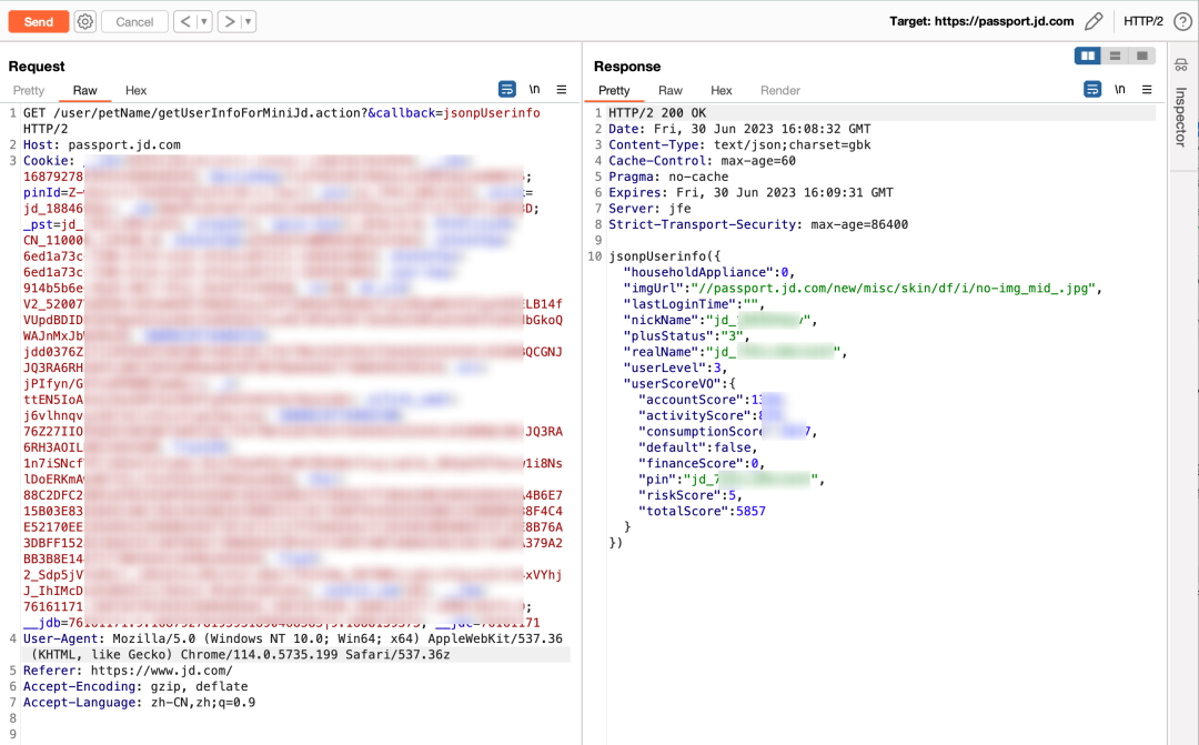 所以大家可以看出,如果一个网站将用户敏感信息以动态脚本或者这类接口的形式存储,用户信息可能在无意中被窃取,当然,京东对于敏感信息都加入了额外的校验,这个接口是极少数没有校验的,当然也只有用户等级数据,这里很多红队攻击者可能明白过来自己是怎么被蜜罐儿溯源的了
