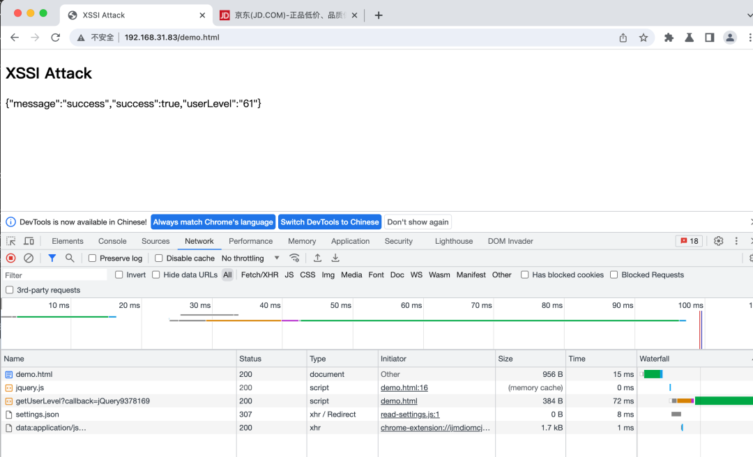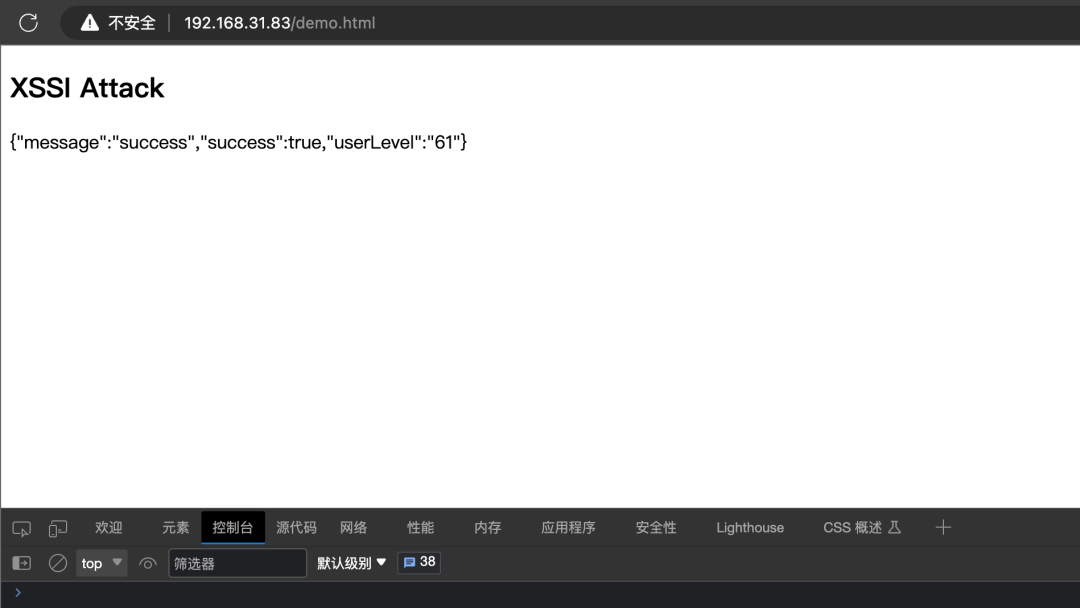 可以看到,恶意页面的 js 成功获取到用户 userLevel 信息,并打印到了页面上,当然,如果攻击者愿意,也可以发送到攻击者服务器上进行存储