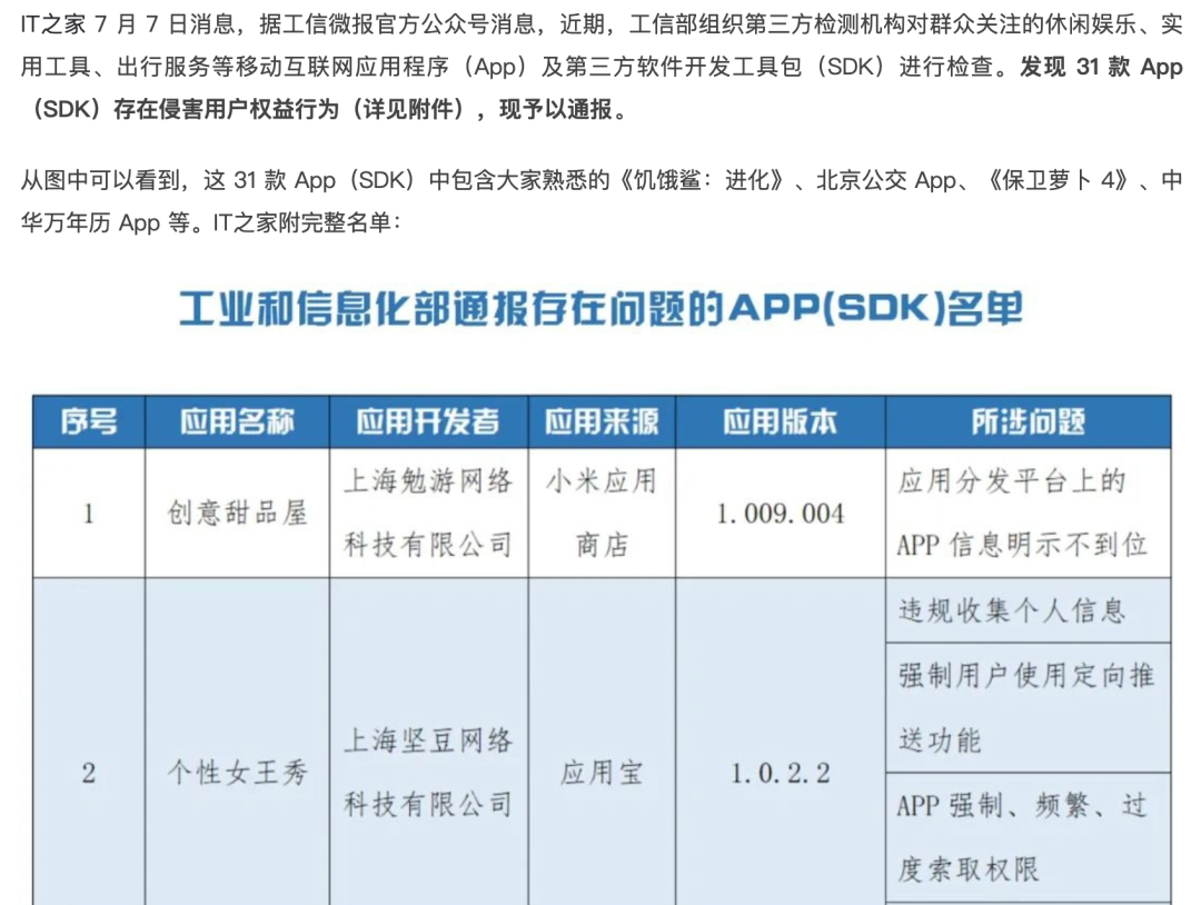 1.工信部通报31款侵害用户权益App(SDK),中华万年历、《保卫萝卜 4》等在列
