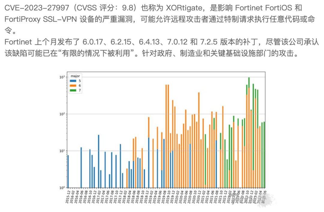 近期,工信部组织第三方检测机构对群众关注的休闲娱乐、实用工具、出行服务等移动互联网应用程序App及第三方软件开发工具包SDK进行检查,发现31款App(SDK)存在侵害用户权益行为,现予以通报。*若出现二维码无法扫描或无法跳转等情况,可复制以下链接到浏览器查看原文https://www.ithome.com/0/704/400.htm2.警报:330,000个FortiGate防火墙仍未修补CVE-2023-27997 RCE缺陷