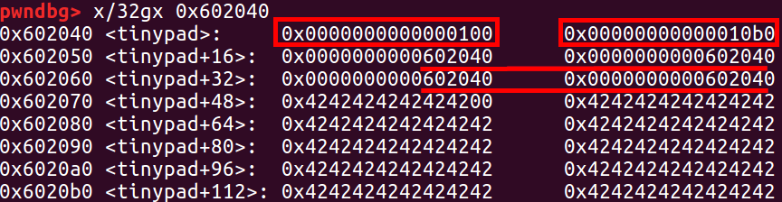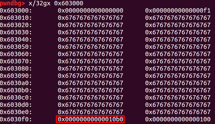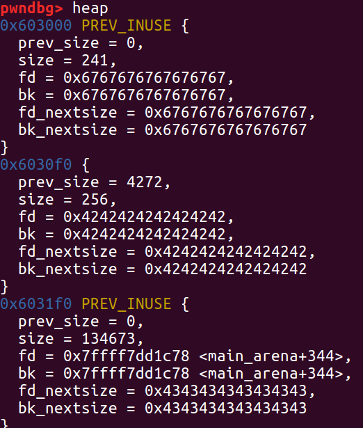 printf("\nb.size: %#lx\n", *b_size_ptr); // 覆盖前:b.size = 0x101(0xf8+0x8+1)