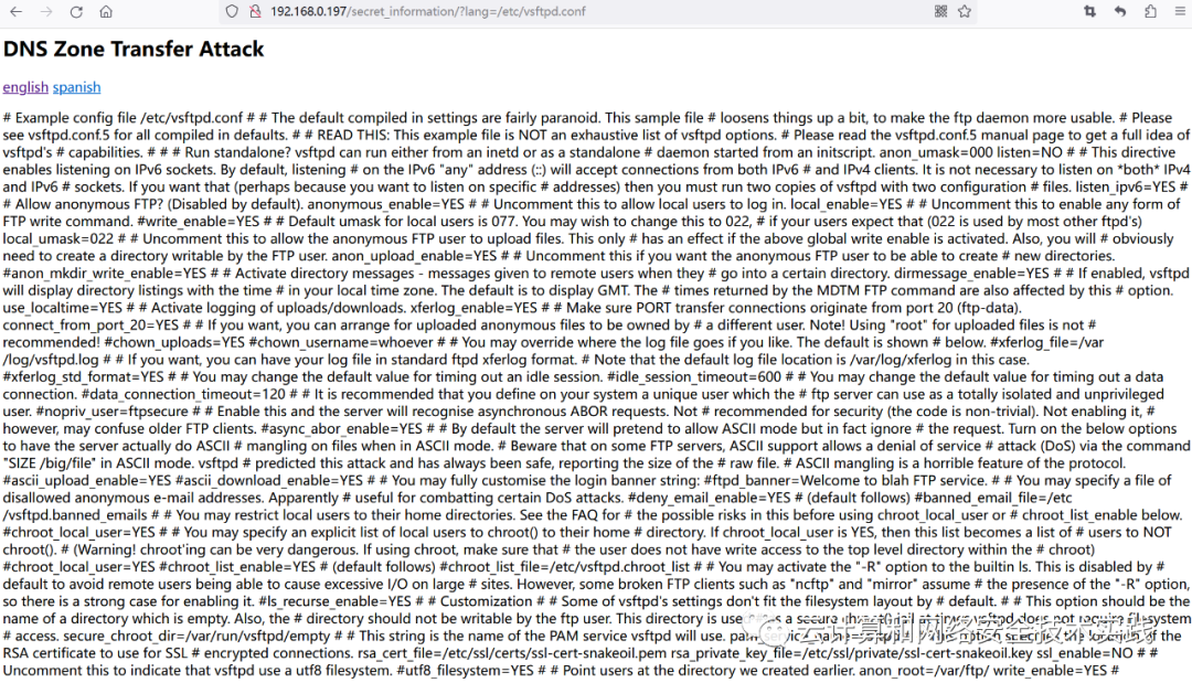 http://192.168.0.197/secret_information/?lang=/etc/vsftpd.conf,