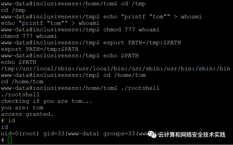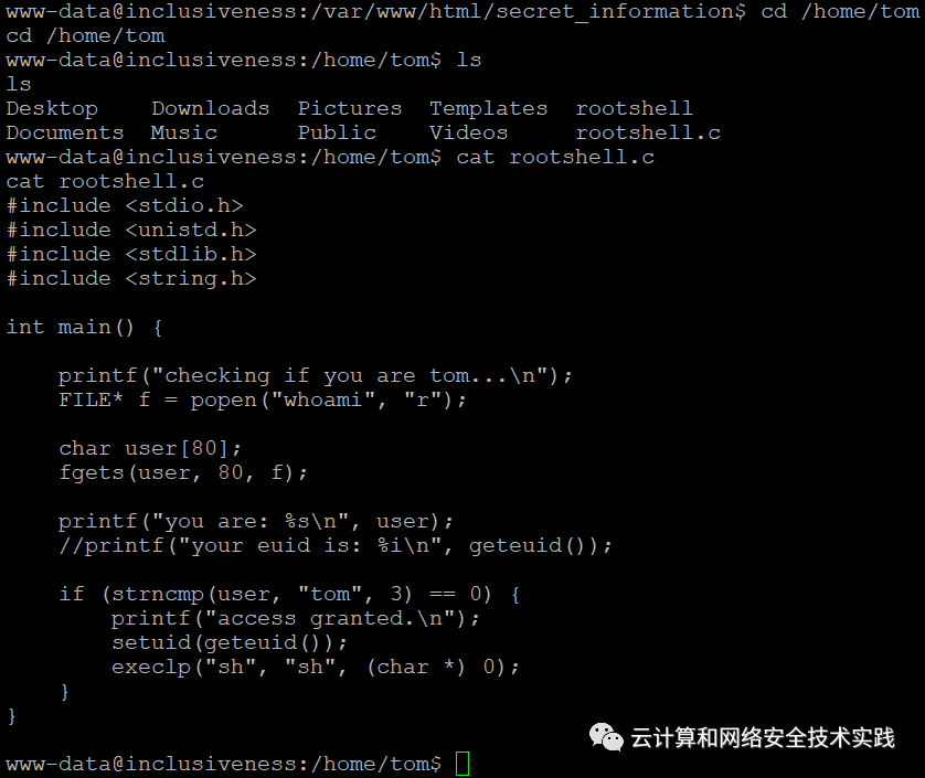 回到rootshell程序所在目录,cd /home/tom,执行,./rootshell,