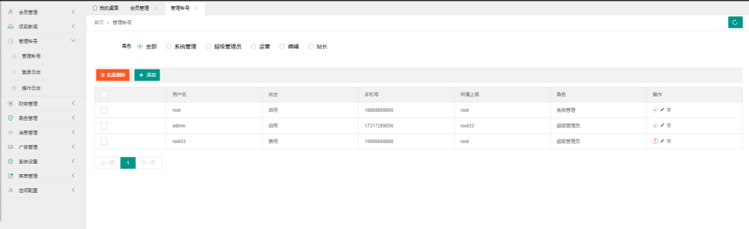 在管理账号里看到启用的超级管理员只有admin