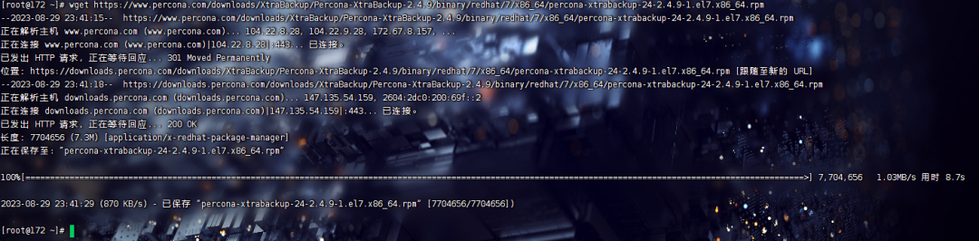 wget https://www.percona.com/downloads/XtraBackup/Percona-XtraBackup-2.4.9/binary/redhat/7/x86_64/percona-xtrabackup-24-2.4.9-1.el7.x86_64.rpm