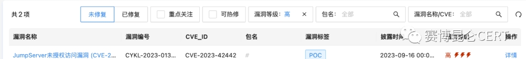 目前赛博昆仑的资产风险检测模块能够检测系统中存在漏洞的JumpServer版本并提示对应风险: