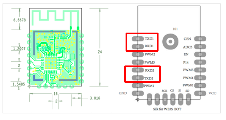 Let’s start to analyze the UART communication port between our main ARM microcontroller and the Tuya WB3S wireless module. The easiest way to sniff communications is to connect the Saleae to the pins of the Tuya module, which are quite large on the board and very easy to reach. The documentation of the module gives us the location of the UART pins: