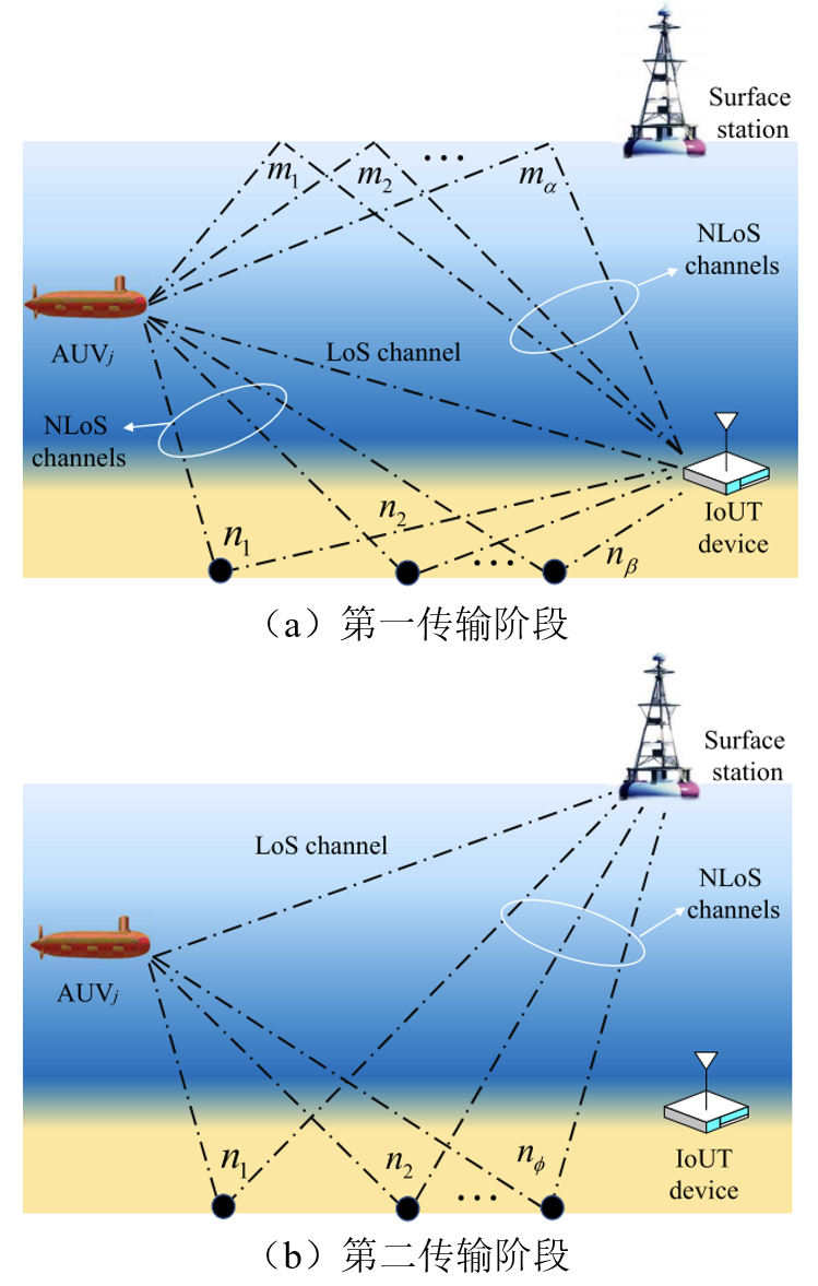 第一阶段传输:IoUT设备→AUV:UAC信道是直接视线(LOS)路径和非视线(NLOS)路径的集合的叠加,其中NLOS路径通常被水下表面、海底和水-空气表面反射。图2(a)描绘了IoUT设备和AUV之间的UAC的几何形状,其中m_u = (x_u^m,y_u^m,H),u∈{1,2,...,α}和n_u = (x_u^n,y_u^n,0),u∈{1,2,...,β}分别是海面和海底的反射点,H是水深。因此,LOS路径的欧几里德距离计算如下