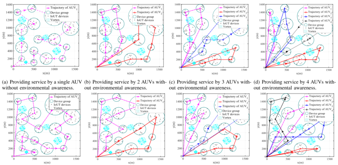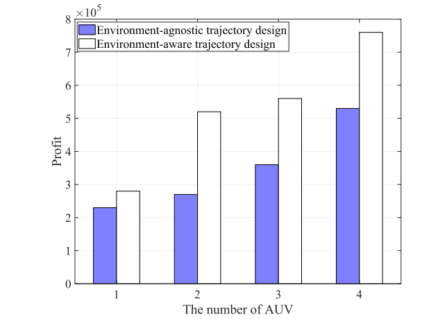 在图5中,本文显示了环境感知和环境不可知轨迹设计与AUV数量之间的利润比较,与图4中所示的结果相对应。观察到环境感知轨迹设计优于不可知轨迹设计。此外,随着AUV数量的增加,整个系统的收益也会增加,因为多个AUV的协作比单个AUV表现出更大的灵活性。