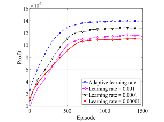 在深度强化学习中,超参数的设置至关重要,因为它会严重影响算法的性能。作为A3C中一个重要的超参数,学习率对收敛速度有很大的影响,但不能得到理论上的最优值。如果学习率设置得太低,则会减缓算法的收敛速度,增加训练时间。相比之下,如果学习速度过快,参数可能会在最优值两侧来回摆动,无法收敛。在图10中,本文研究了学习速度对A3C收敛性能的影响。可以观察到,具有自适应学习率的算法优于其他算法,它会根据训练过程逐步调整学习率。