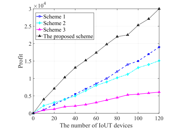 图8 不同计算和通信分配方案的收益与IoUT设备数量的关系