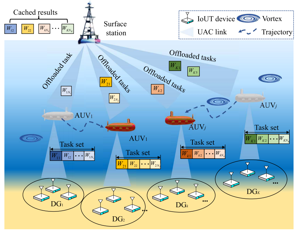 图1是本文的 MTUC 架构,其中多个 AUV 与地面站进行永久巡航通信,为分布在多个设备组 (DG) 中的一组 IoUT 设备提供计算服务。每台AUV从地面站下方的原点出发,依次支援指定的DG。本文假设有一个地面站、M 个 AUV 和 K 个 DG。M 个 AUV 由集合 AUV = {AUV_1, AUV_2,..., AUV_M }表示,而 K 个 DG 由集合 DG = {DG_1, DG_2,..., DG_K}表示。假设DG_k中总共有N_k个IoUT设备,它们由集合ND_k = {n_k1,n_k2,...,n_kNk}表示。