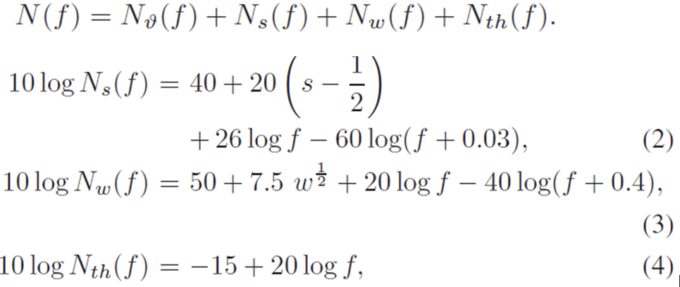 噪声模型:海洋中的环境噪声可能是由气泡、船舶活动、表面风场等引起的。在通信频率f下,四种主要类型的噪声的功率谱密度(p.s.d )(以dB/Hz为单位)可以表示为