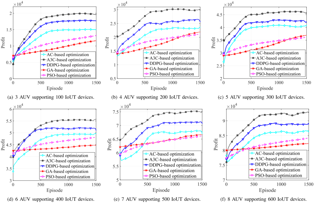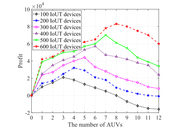 图 6 描绘了利润与服务不同数量 IoUT 设备的 AUV 数量的关系。观察到为给定数量的 IoUT 设备提供服务的 AUV 数量始终存在最佳解决方案。例如,对于300个IoUT设备,使用5个AUV提供服务可以获得最高的利润。此外可以从图 6 中观察到,如果所有其他条件保持不变,则增加设备数量会增加系统的效益。这样做的原因是,当设备数量增加时,将相同的能耗分配给AUV的运动可以支持更多的IoUT设备,从而获得更高的收入,进一步提高利润。