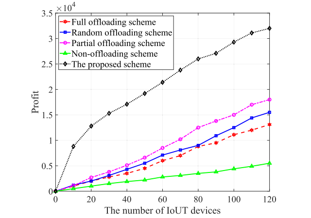 为了描述卸载方案对系统利润的影响,在图7中展示了不同任务卸载方案的利润。完全卸载方案是指所有IoUT设备选择将其任务卸载到地面工作站处理,而非卸载方案是指所有IoUT设备在本地处理其任务。其中,随机卸载方案是指每个设备随机选择是否将其计算任务卸载到地面工作站,而部分卸载方案是指指定一定比例的任务卸载到地面工作站,并留下一些任务在本地处理。非卸载方案虽然可以满足设备的要求,但由于IoUT设备的能量耗散难以充电,因此其所要支付的成本远远高于将任务卸载到MTUC框架处理的成本。IoUT设备也比可以连续充电的AUV更难充电。同样,地面站可能更容易充电。此外,当选择将一些任务卸载给MTUC时,所收集的利润显着增加。明确地说,由于该方案能够在有限的资源下寻找最优的卸载策略以实现利润最大化,因此始终优于其他卸载方案。