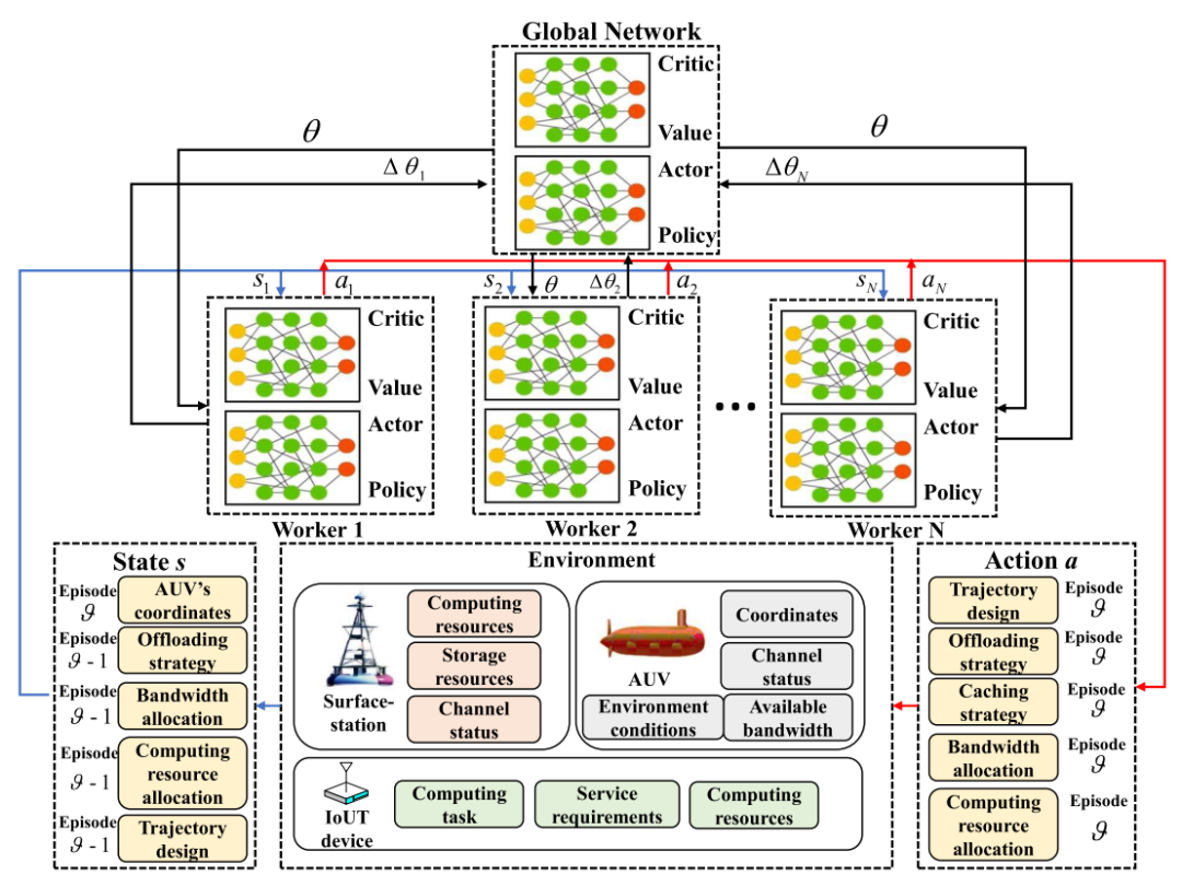为了满足 IoUT 应用的严格要求,本文通过合理分配地面站、AUV 和 IoUT 设备的计算、通信和存储资源,提出了一种 MTUC 框架。此外,在此框架下,本文设想了一个系统级优化问题,以最大化 MTUC 框架的利润为目的,依靠联合优化 AUV 的环境感知轨迹设计、计算卸载、数据缓存、通信和计算资源分配。由于所提出的问题是NP-hard且高维,本文将其转化为MDP并进一步采用A3C算法进行求解。