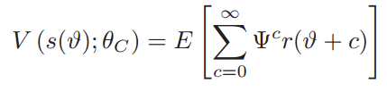 具体来说,在每个episode中,价值网络预测的估计状态值用V[s(ϑ);θ_C] 表示。智能体根据策略 π [a(ϑ) | s(ϑ) ]在当前状态s(ϑ) 执行动作a(ϑ),然后环境将改变到下一个状态s(ϑ + 1)并产生奖励r(ϑ)。A3C的状态值函数表示为