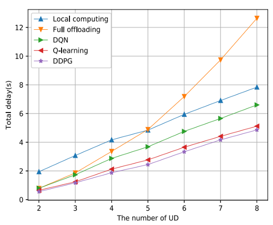 如图3所示,所有方案的总延迟随着UD数的增加而增加。然而,当用户数量超过5时,Full offloading方案的总延迟最高。这是因为此时所有任务都被卸载到MEC服务器上,而MEC服务器由于计算能力有限,无法满足所有UD的计算要求。此时,MEC服务器的计算能力是影响用户体验质量的主要因素。与其他算法相比,Q-learning算法和DDPG算法具有更低的时延。