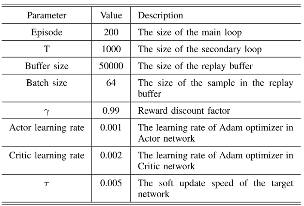 Actor网络的隐藏层由全连接层组成。目标actor网络的结构与actor网络的网络结构相同。Critic网络的输入层由两部分组成,一部分是IIoT系统状态,另一部分是每个UD的计算卸载策略向量。Critic网络输出层的维数为1,表示Q值的预测。Critic网络的隐层由完连接层组成。目标critic网络与critic网络具有相同的结构。