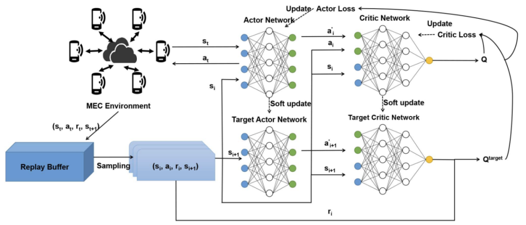 在本文中,提出了一个智能自主部分卸载系统(IAPO ),用于处理多用户IIoT MEC系统中延迟敏感的计算任务。这种计算卸载模型考虑了部分计算卸载的情况,允许在本地和MEC服务器上并行处理计算任务。本文首先提出了一个Q-learning方案。针对部分计算卸载的问题,使用Q-learning算法并根据预定义的比率执行部分计算卸载。然而,随着用户设备(UD)数量的增加,状态空间会急剧增加,而预定义的计算卸载率的增加也将意味着动作空间的增加。此外,人工预定义的计算卸载率不够精细,使得计算任务的并行性无法得到充分利用。因此,本文随后提出了基于深度强化学习(DRL)的的解决方案。具体来说,本文使用深度确定性策略梯度(DDPG)算法,通过DDPG算法中的演员(actor)网络来制定计算卸载策略。Actor网络的输出空间是一个连续的动作空间,意味着任务能以任意比例卸载。Actor网络解决了部分计算卸载的问题。本文在DDPG算法中使用批评家(critic)网络来估计Q值,而不是Q表。Critic网络解决了由于Q表维数大而导致的搜索困难的问题。