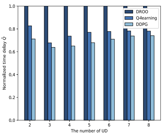 如图5所示,DROO的计算卸载方案的归一化时延是1,这意味着DROO方案可以找到最好的二进制卸载策略。本文提出的部分卸载策略的归一化时延都低于1。其中,Q-learning算法比最佳二进制计算卸载策略低23%,DDPG算法比最佳二进制计算卸载策略低30%。因此,部分计算卸载能更好地减少系统总延时和提高用户体验质量。